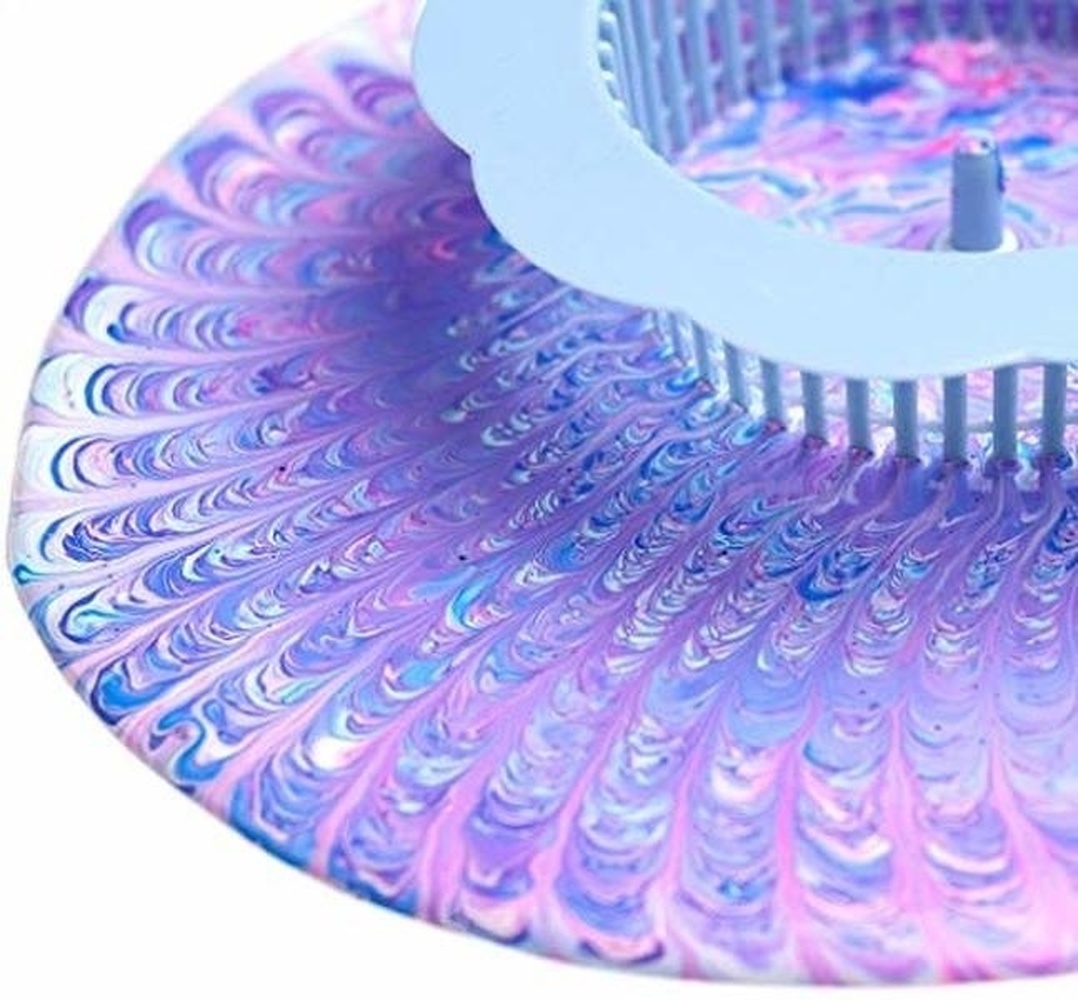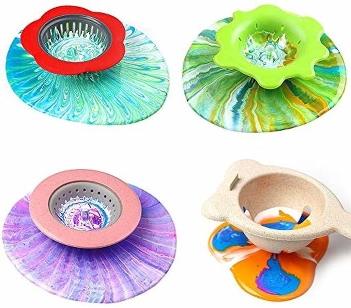 4.Mixed dye has prepared already, put our pouring strainers on the desk and slowly pour your mixed dye down by circle. Now begin your amazing awesome painting.