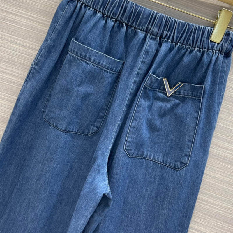 22 Summer Elastic Thin Denim Waistband Wide Leg Pants Women Casual Blue Wide Hem Trousers Luxurious V Hardware Straight TrouserA0458