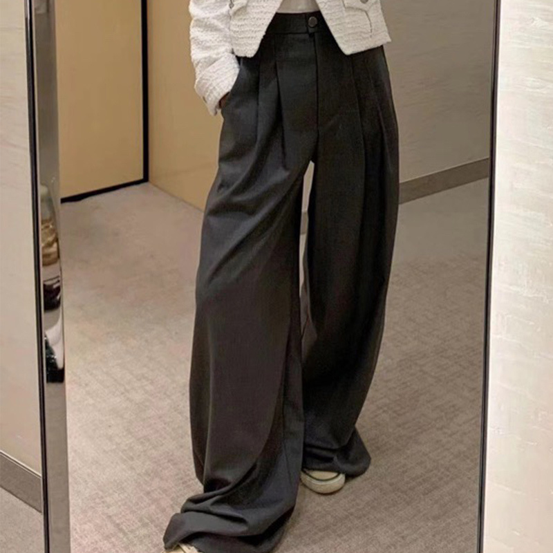 22 Wool Silk High Waisted Wide Leg Pants Women Casual Grey Button Zip Trouser Pleated Letter Logo Webbing Loose Mopping TrousersA0469