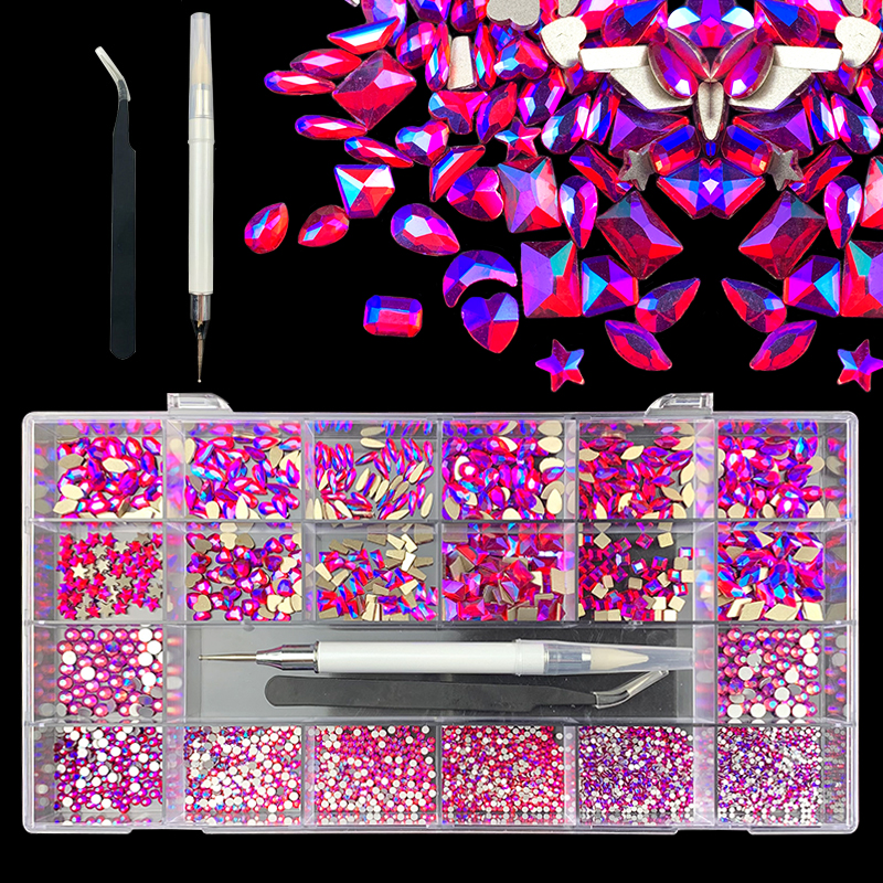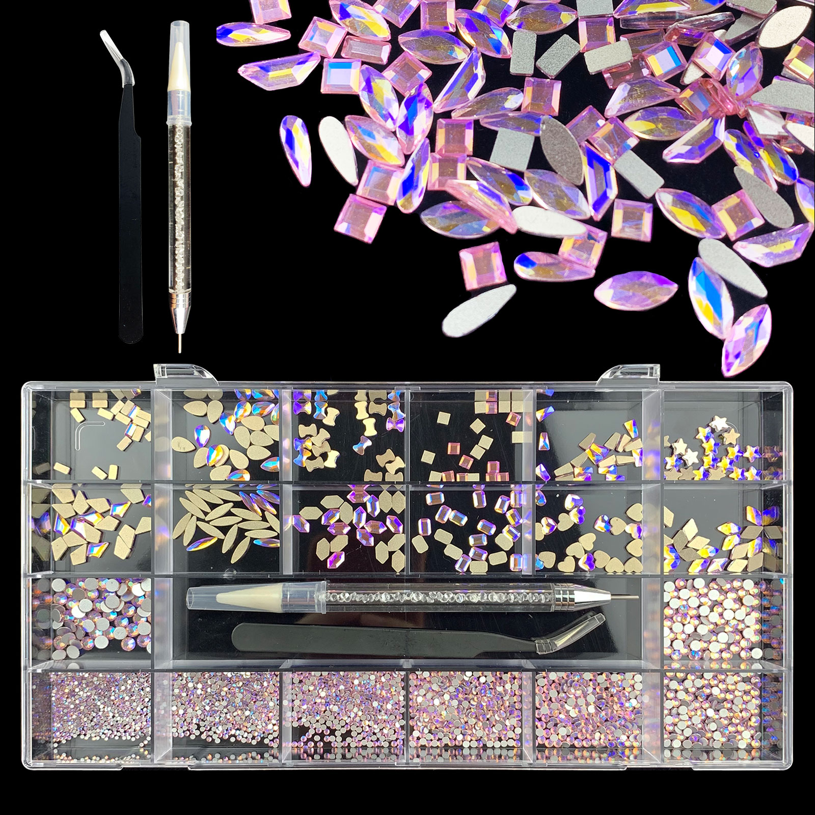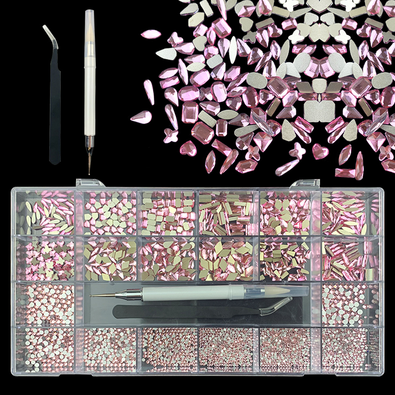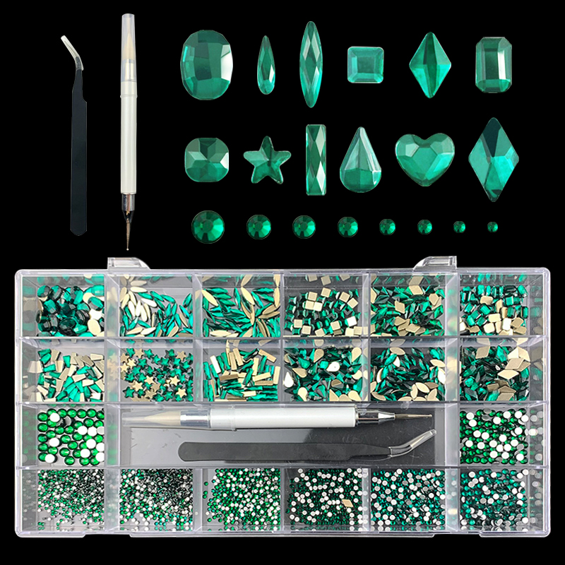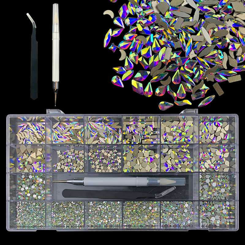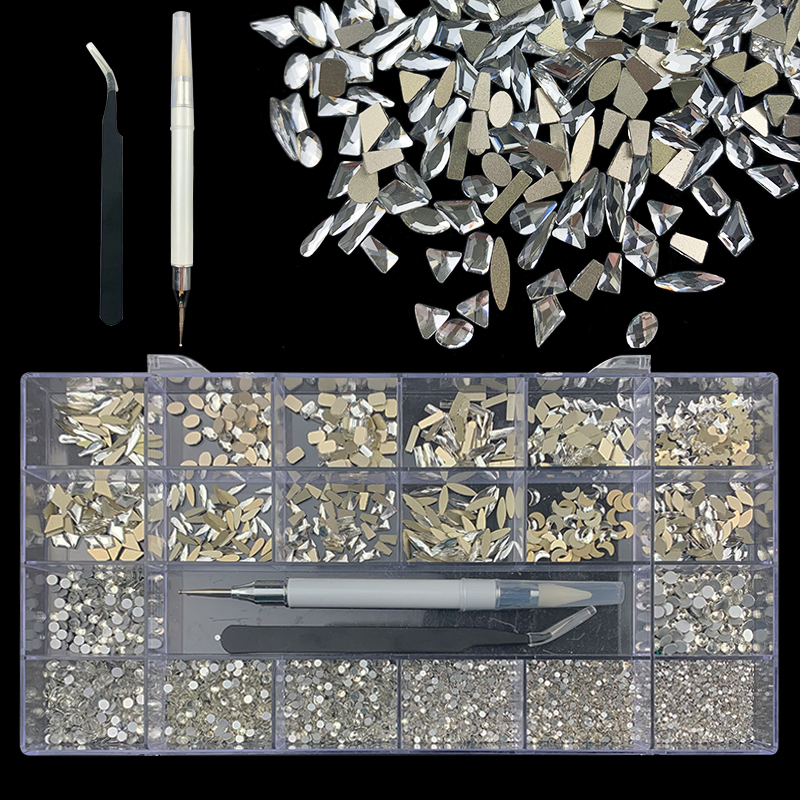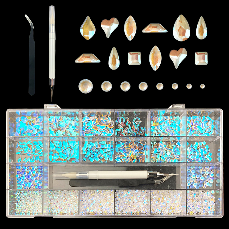 3). 3100pcs Rhinestone set: 480pcs(20x24) k9 crystal glass rhinestones, 2500pcs mix sizes round rhinestones,1pcs wax pen(Crystal or white), 1pcs tweezers for free