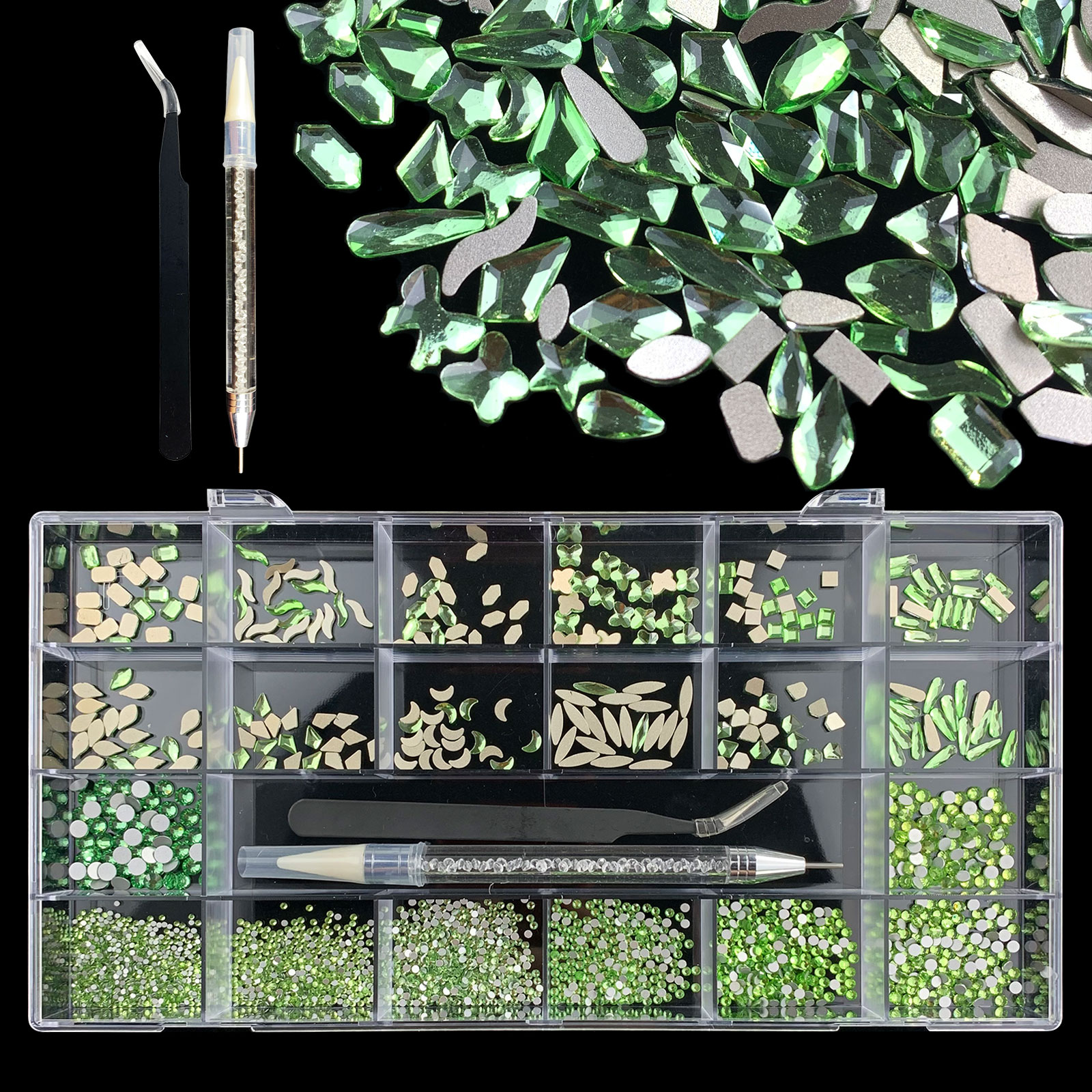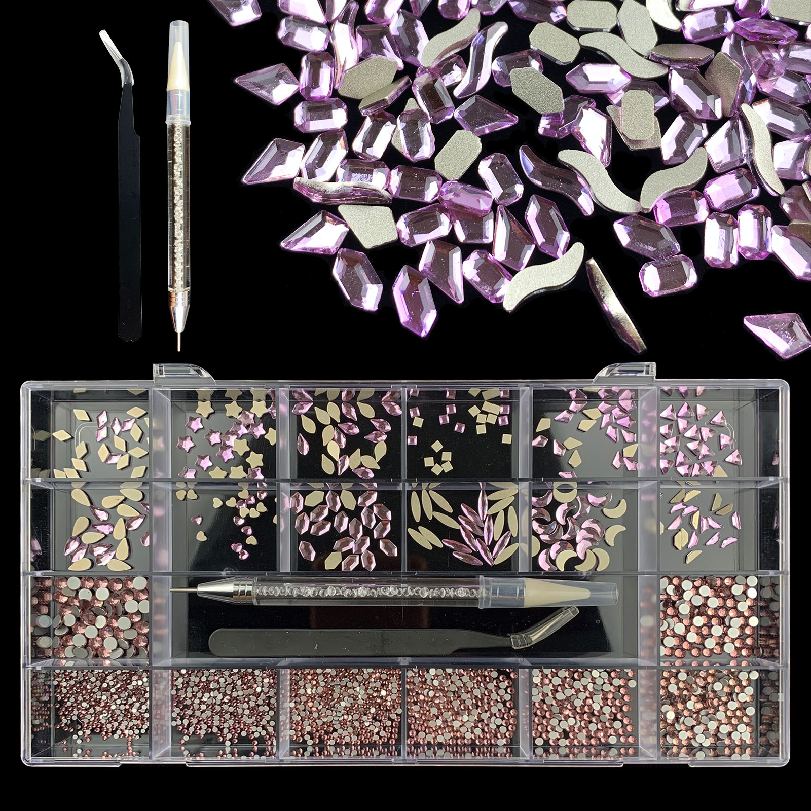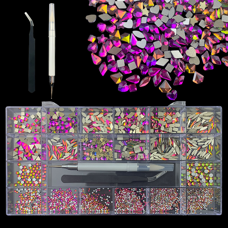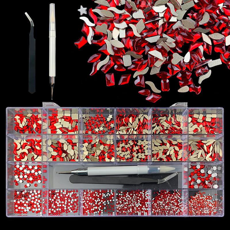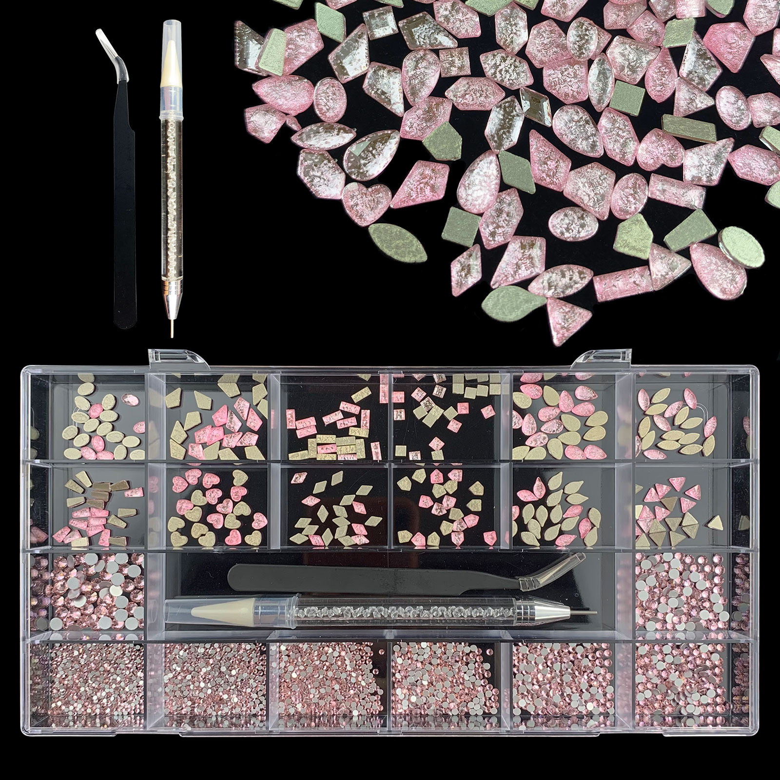 3). 3100pcs Rhinestone set: 480pcs(20x24) k9 crystal glass rhinestones, 2500pcs mix sizes round rhinestones,1pcs wax pen(Crystal or white), 1pcs tweezers for free