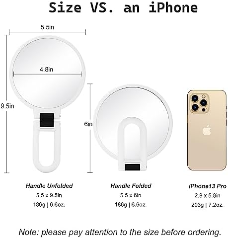 What's in the Box 2-in-1 double-sided mirror with 1x & 30x magnification 3 Options of Color Black / White / Army Green Package Dimensions 6"L x 5.5"W x 1.2"H Product Dimensions Handle Unfolded:9.5"L x 5.5"W | Handle Folded: 6"L x 5.5"W Diameter 4.8 inches viewing area Weight 186g / 6.6Oz Material Premium ABS frame & HD thickened glass