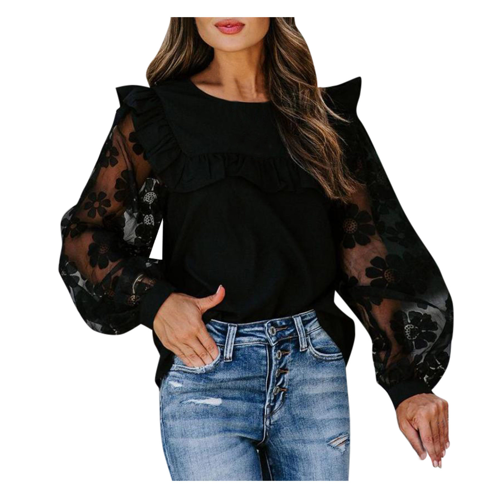 Fashion Women's Round Neck Lace Patchwork Ruffle Long Sleeve Top
