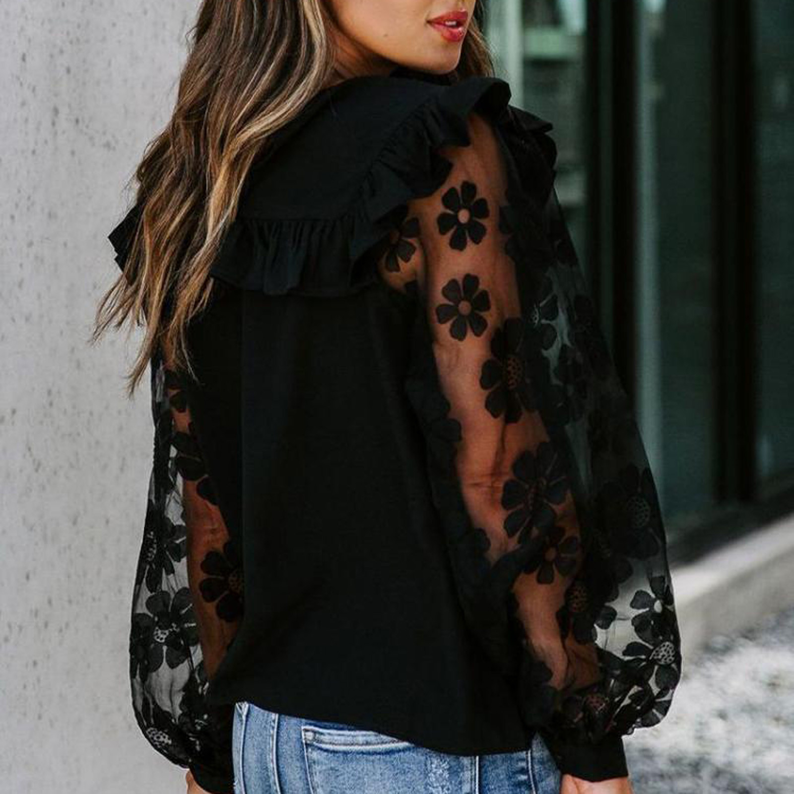 40# Women's Ruffle Blouses tops Net yarn Round Neck Lace Patchwork Long Sleeve Blouses Top Mesh Gauze sexy Retro Shirts рубашка
