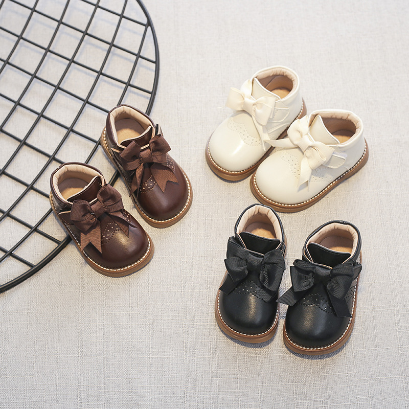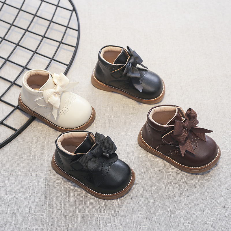 2021 Anti-slippery Genuine Leather Baby Girls Boots with Butterfly-knot Casual Flat Heel Autumn Winter Baby Girl Shoes E08044
