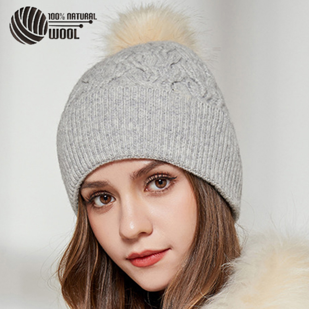 Australian Merino Wool Hat with Real Fox Fur Pompom Women Winter Knit Slouchy Beanie Cashmere Skullies Hats For Girls