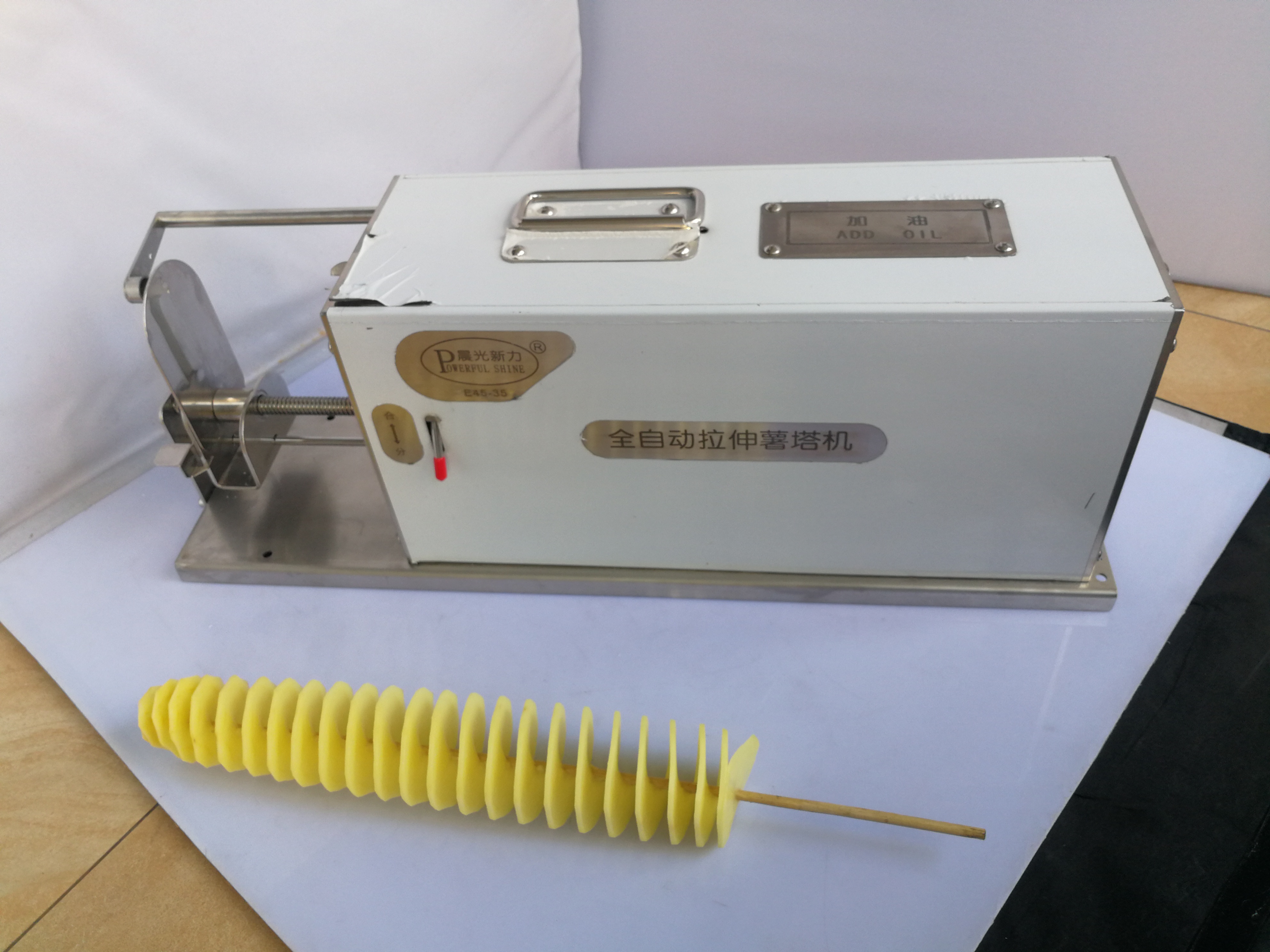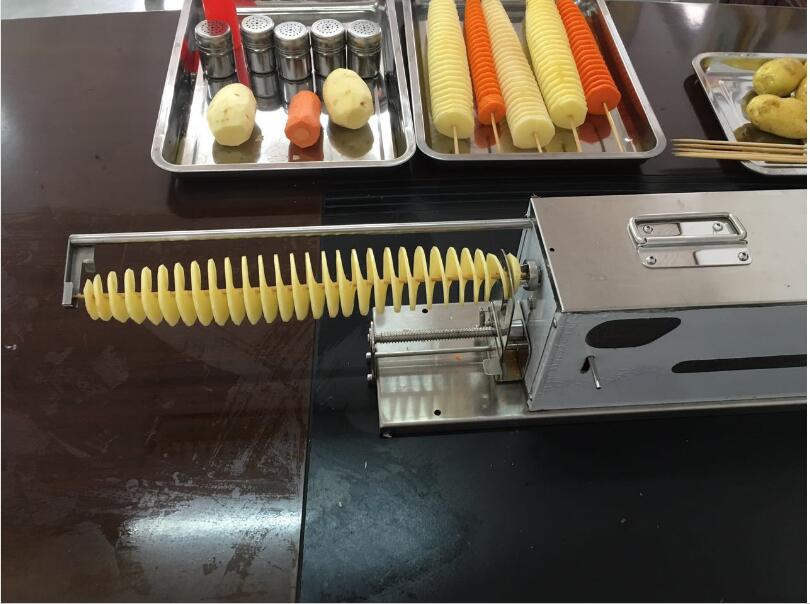 2 bamboo into a potato, then fresh potatoes into potato tower, the machine will cut potato rotation, becomes a rotary cut potato!