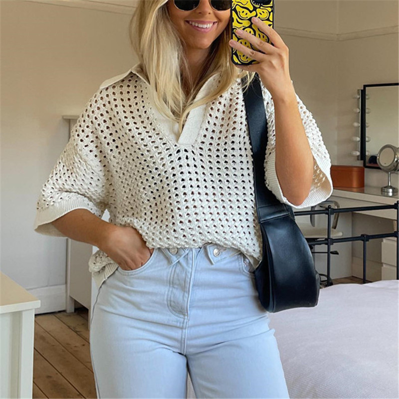 Basic Knitted Hollow Polo Women Short Sleeve Top Loose Casual Solid Color Polo Shirt Women Street Outfit Spring Summer シャツ