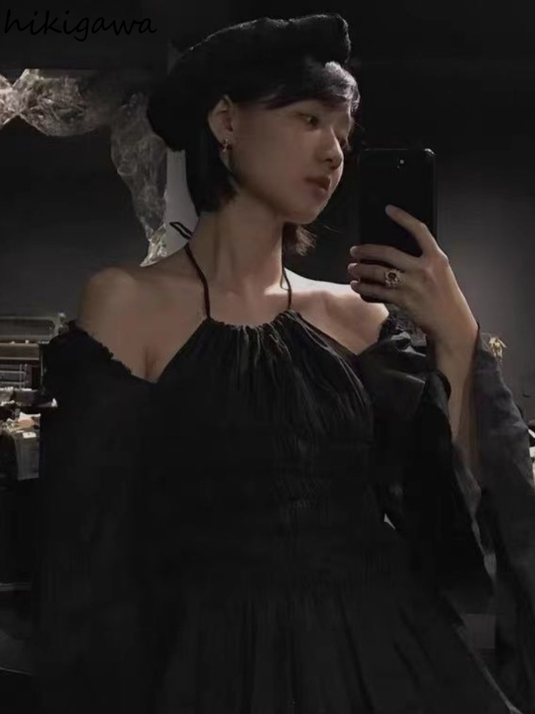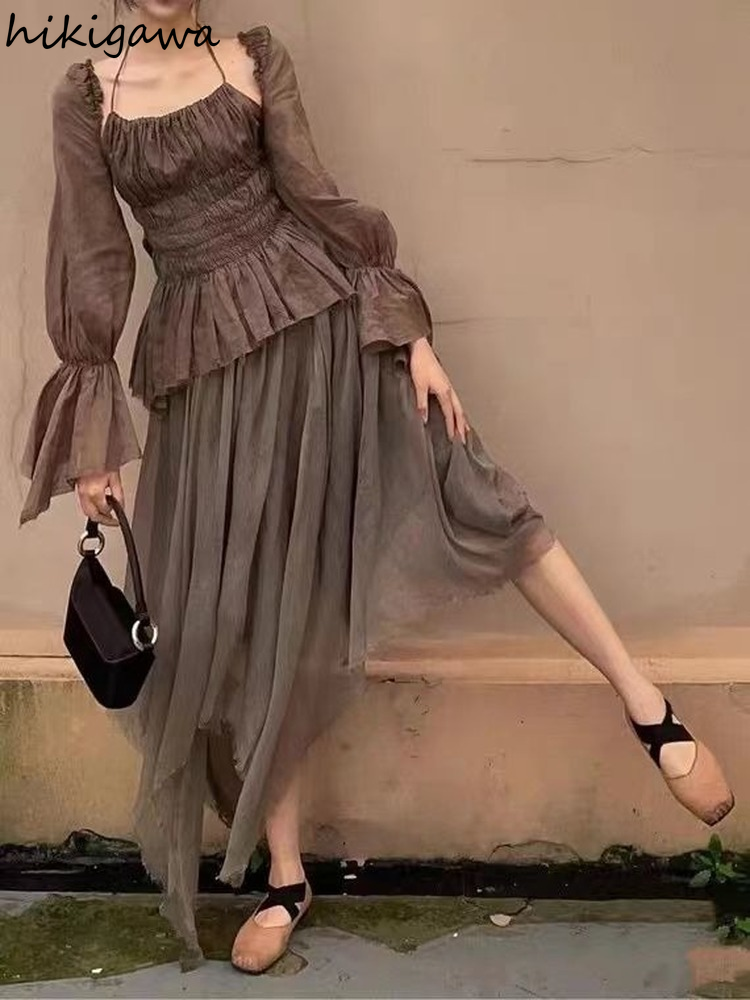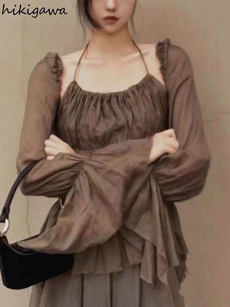 Blouse Women Sexy Off Shoulder Long Sleeve Thin Shirts Slim Folds Flare Sleeve Blouses Vintage Tops Femme Blusas De Mujer