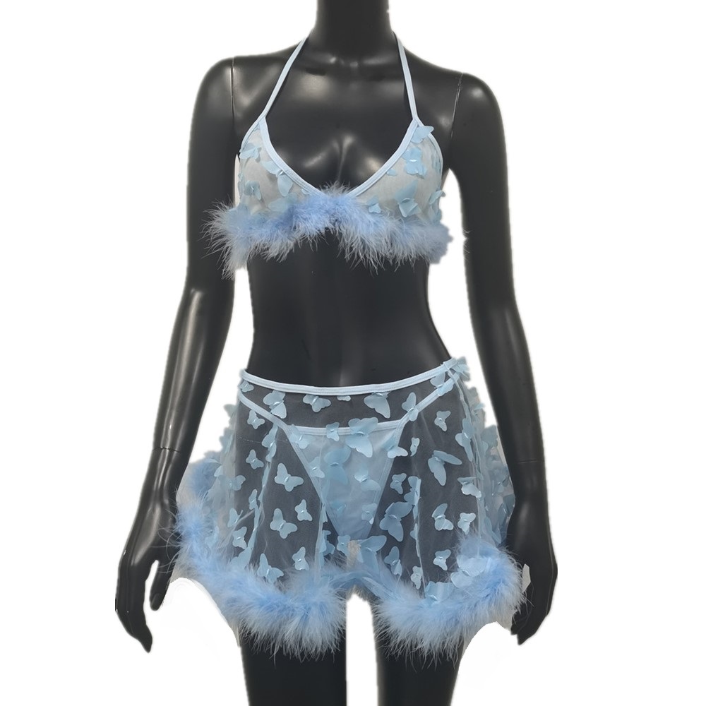 Butterfly Wing Mesh See Through Mini Skirt Sexy Furry Fur Feather Crop Top Thong Women Sets Club Festival Party 3 Piece Outfit