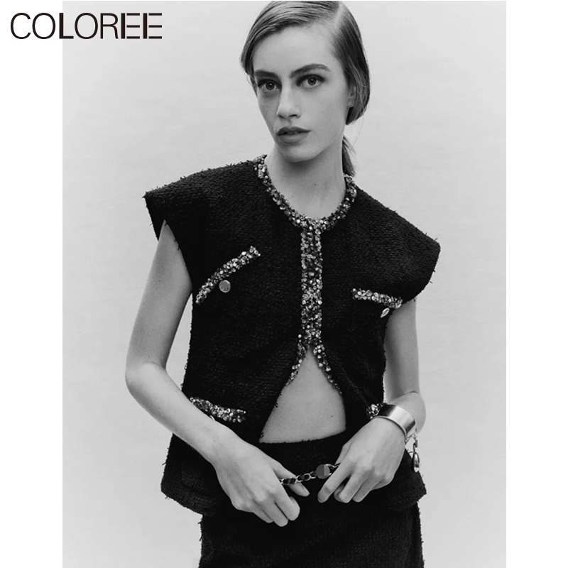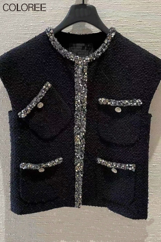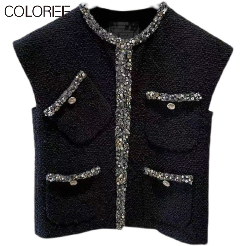 Designer Clothes for Women Autumn Winter Vintage O-neck Sleeveless Jaqueta Feminina Black Tweed Vests Streetwear