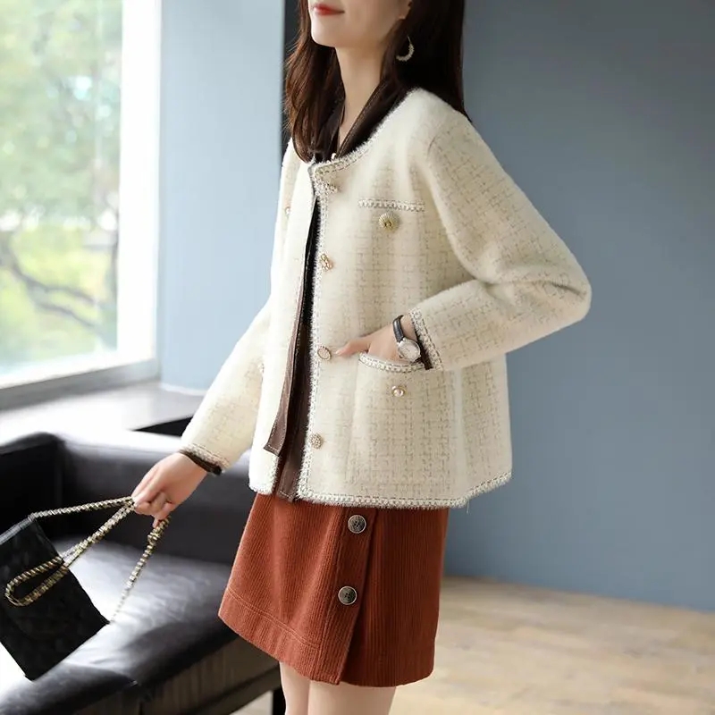 Elegant Crew Neck Soft Mink Cashmere Short Jacket Chic Pearl Button Long Sleeve Design Sweater Cardigan Style Knit Coat