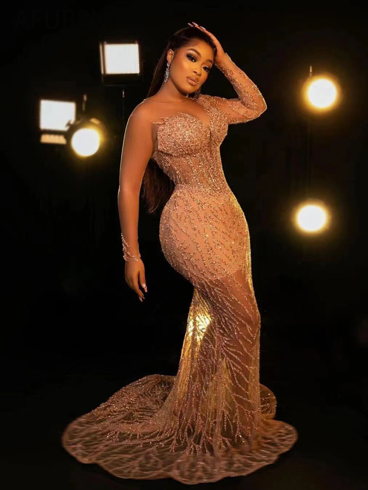 Evening Dresses Mermaid O Neck Long Sleeve Bronzing Appliques Tulle Long Party Gown Robe Soiree Sexy Formal Dress Vestido