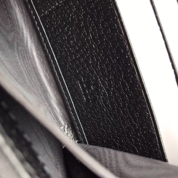 The Gucci bee—a historical symbol from the ’70s archives—is combined with the star motif. The print appears in metallic gold printed against black leather in the long zip around wallet.