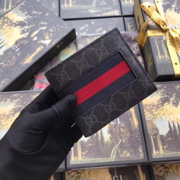 Gucci’s Bi-fold wallet is decorated with the powerhouse’s signature striped canvas webbing – a pairing that’s so iconic. It’s been made from GG Supreme canvas with leather lining. There’s space and slots to store eight cards and two bill compartments inside.