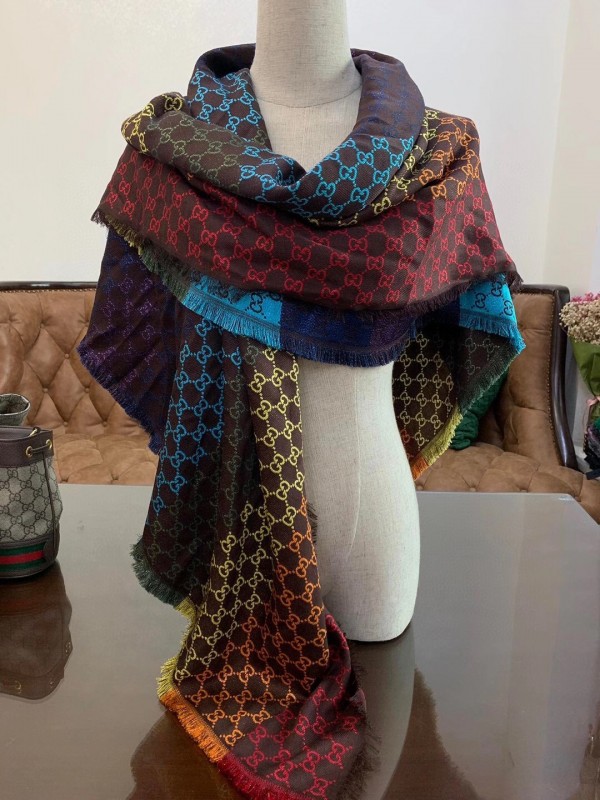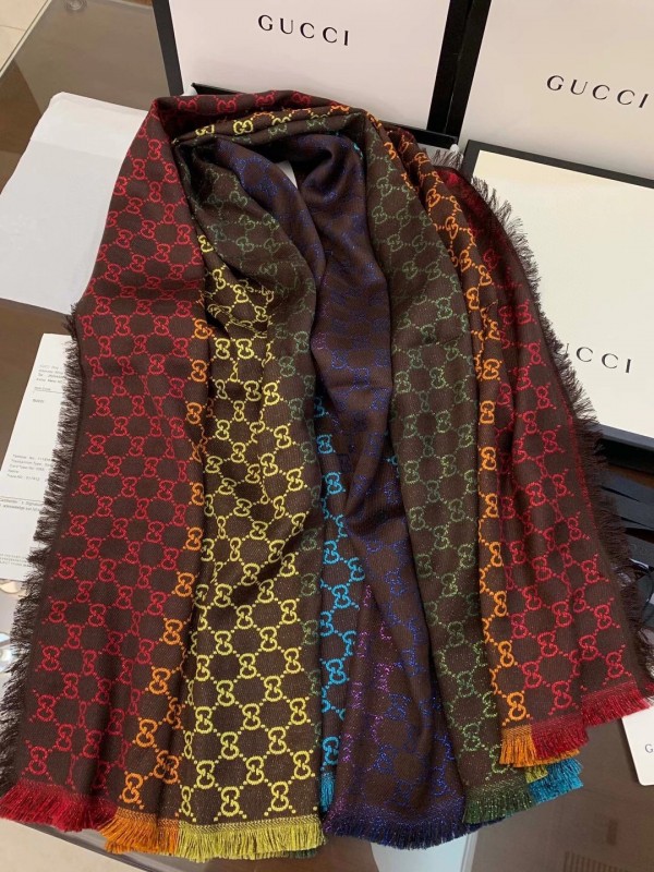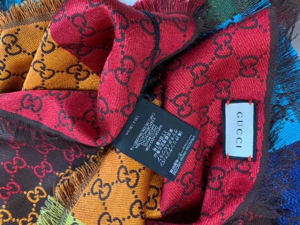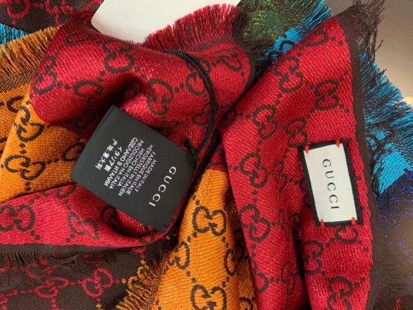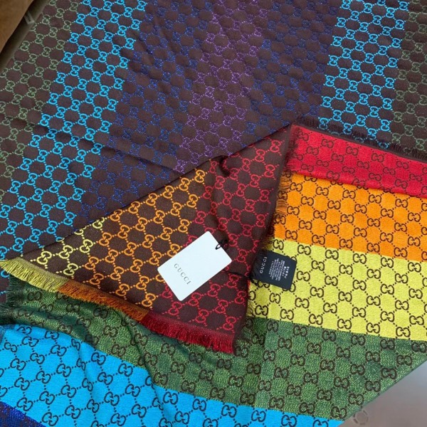 An evolution of the original Gucci rhombi design, the GG logo has become an established symbol of Gucci’s heritage. Integrated within the Cruise 2019 collection, the distinctive pattern is reimagined in combination with a metallic rainbow pattern. It is crafted from a blend of viscose, cotton, silk and wool for an accessory that feels supremely soft to the touch and is lightweight to wear.
