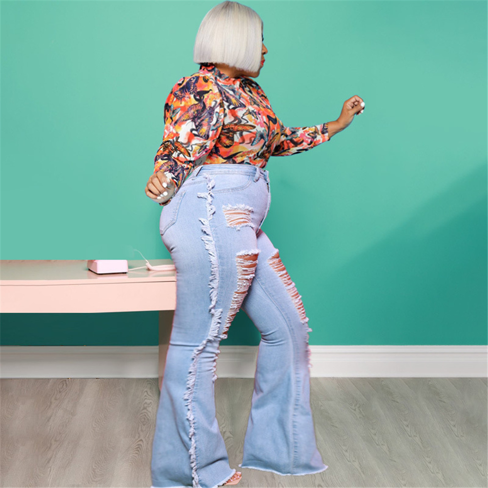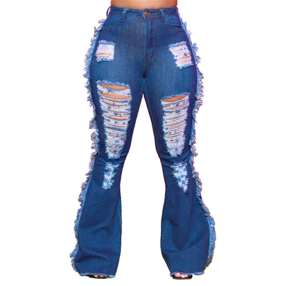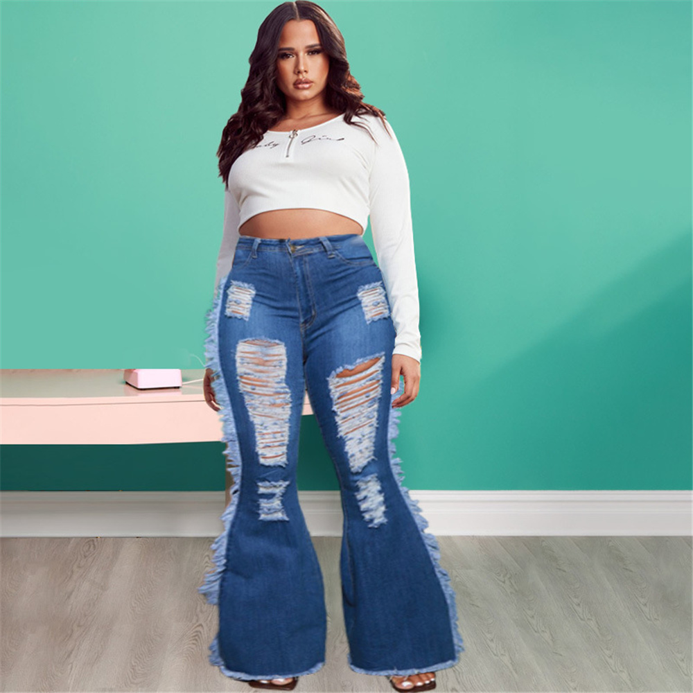 HAOOHU Street Wear Urban Plus Size Women Jeans High Waist Hole Tassel Wash Water Vintage Casual Flared Pants Wholesale