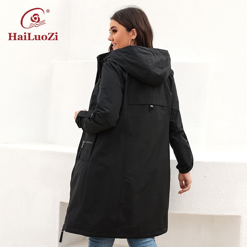HaiLuoZi Spring Autumn Hood Zipper Windbreaker Women's Mid-Length Trench Coat Plus Size Female Big Pockets Outerwear 9663