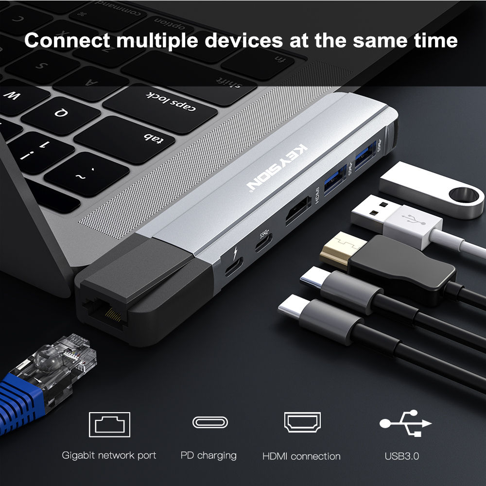 - 6 in 1 USB HUB :Thunderbolt 3*1, HDMI*1, USB 3.0*2, RJ45*1, Type-C USB-C Data transmission *1