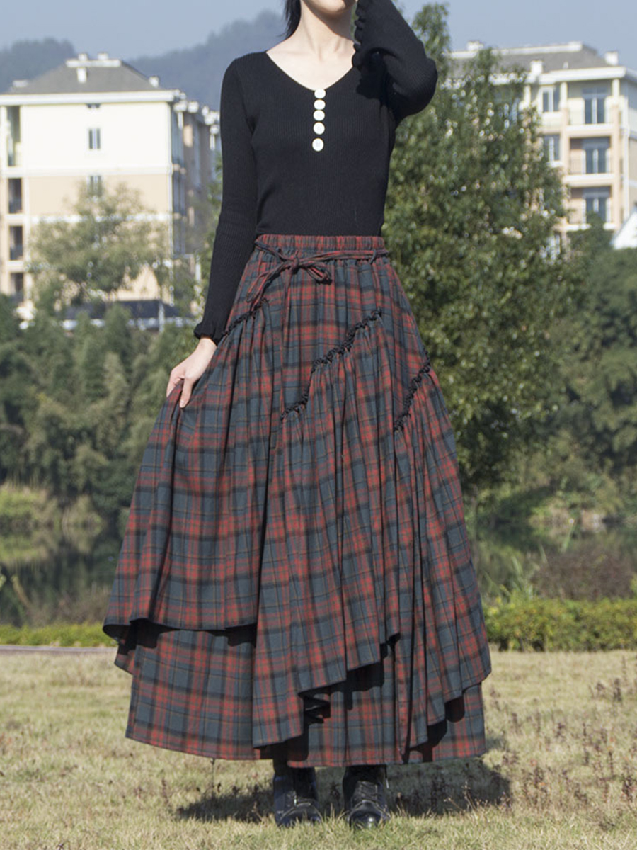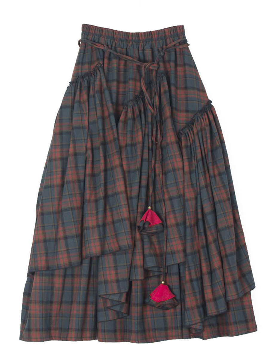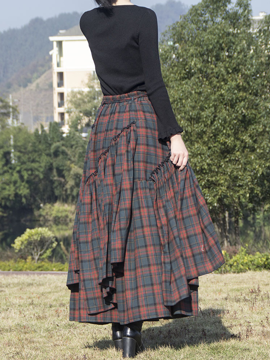 Kalenmos Literary Retro Check Children's Women Skirts Irregular Hem Lace High Waist Heavy Cotton Brushed Pleated Medieval Skirt