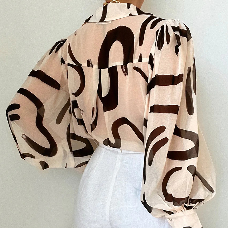 Lapel Single-breasted Loose Blouse Summer Tulle Long Lantern Sleeve Shirts Women Elegant Print Mesh Chiffon Tops Blouse