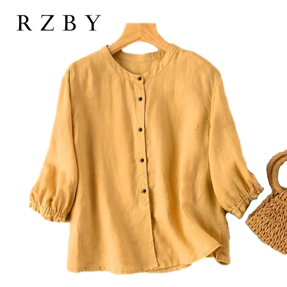Linen Cotton Puff Sleeve Summer Shirts Women Blouse Ladies Loose Vintage Tops Half Sleeve Female Clothing Casual RZBY469