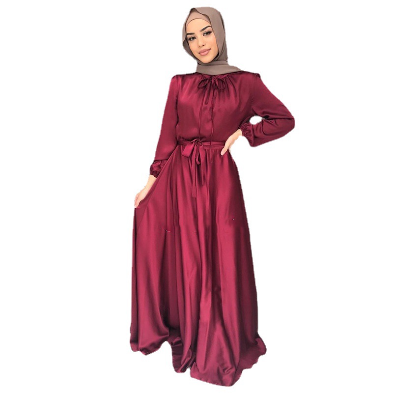Muslim Long Dress Abaya for Women Satin Elegant Long Sleeve Belted Hijab Robe Islam Dubai Turkish Modest Abayas African Dress