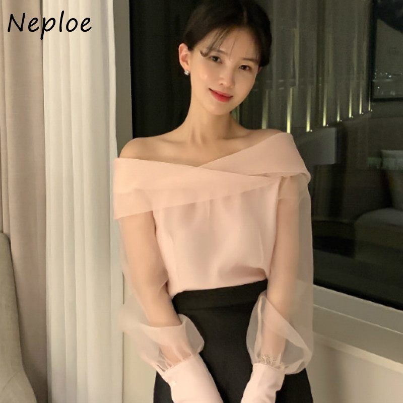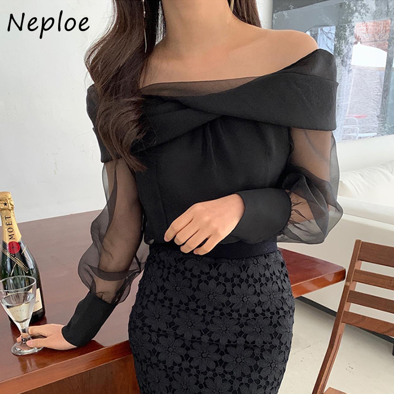 Neploe Slash Neck Shoulder Strapless Mesh Blouse Women Spring Pullover Long Sleeve Blusas Solid Slim Fit Wild Shirt