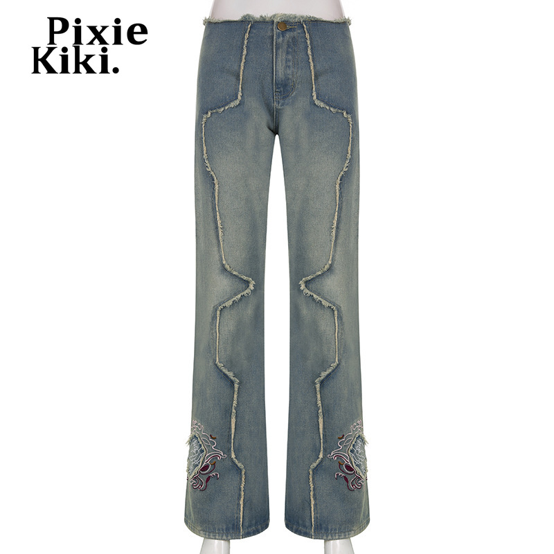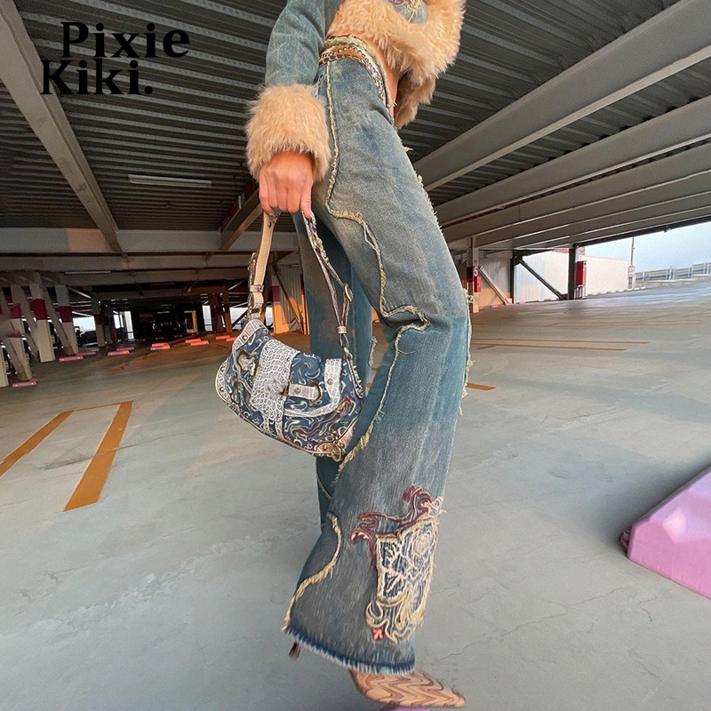 PixieKiki Y2k Embroidery Low Rise Flare Jeans Woman Streetwear 2000s Hippy Vintage Pants Women Denim Trousers P84-FF69