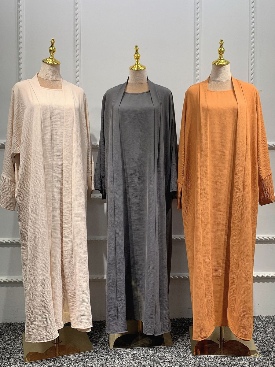 Plain Crepe 2 Piece Abaya Set Matching Outfit Dubai Turkey Women Muslim Modest Clothing Sleeveless Inner Slip Dress with Kimono