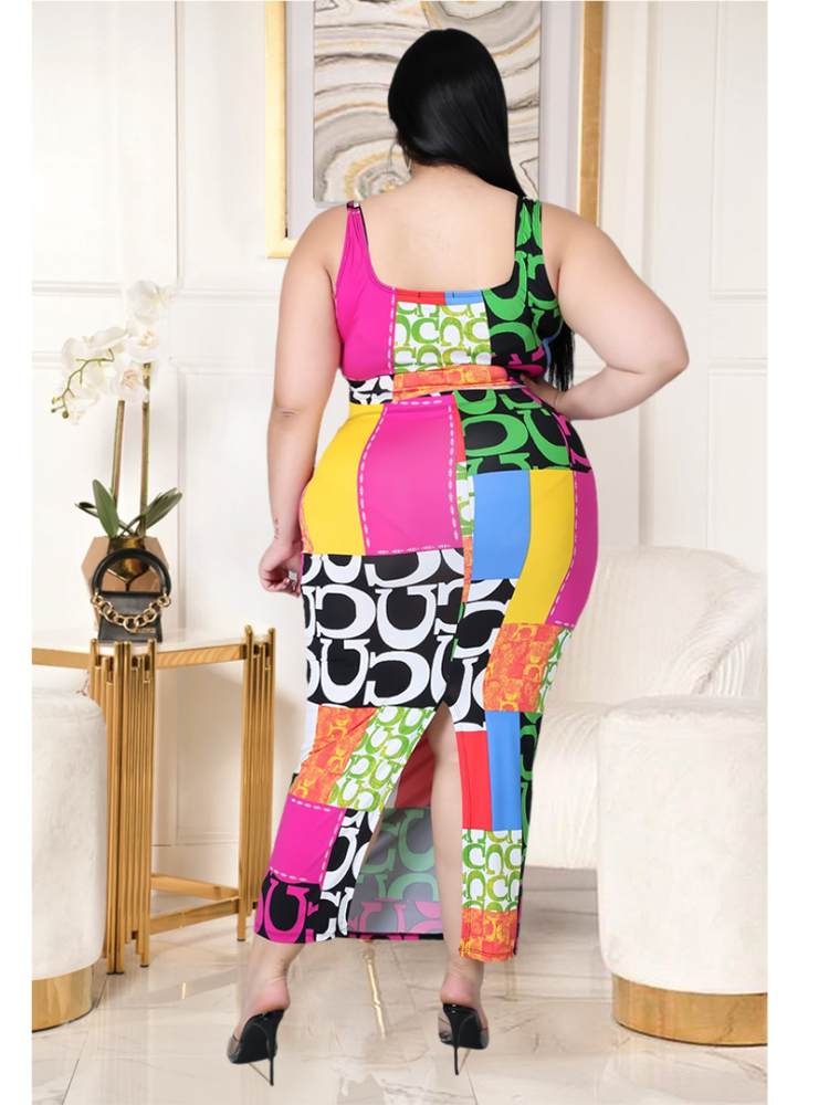 Plus Size Women Clothing Two Piece Set Summer Sleeveless Backless Crop Top Sexy Printing Skinny Dress Roupas Femininas Conjuntos