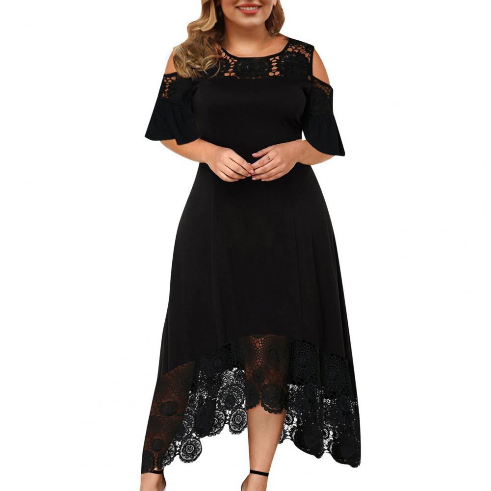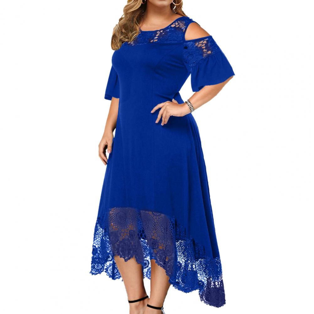 O-neck Flare Short Sleeve Cold Shoulder High-Waist Plus Size Women Dress Embroidery Lace Patchwork High-low Hem Women Dress Party Outfit