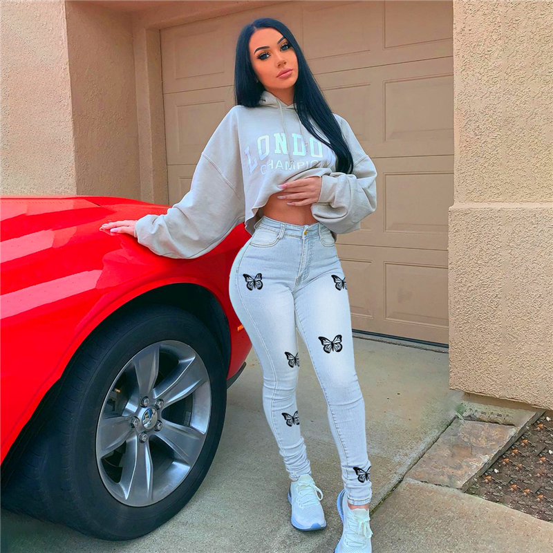 Printed Blue Jeans Women High Waist Skinny Denim Trousers Summer Thin Denim Pencil Pants Office Lady Casual Pants