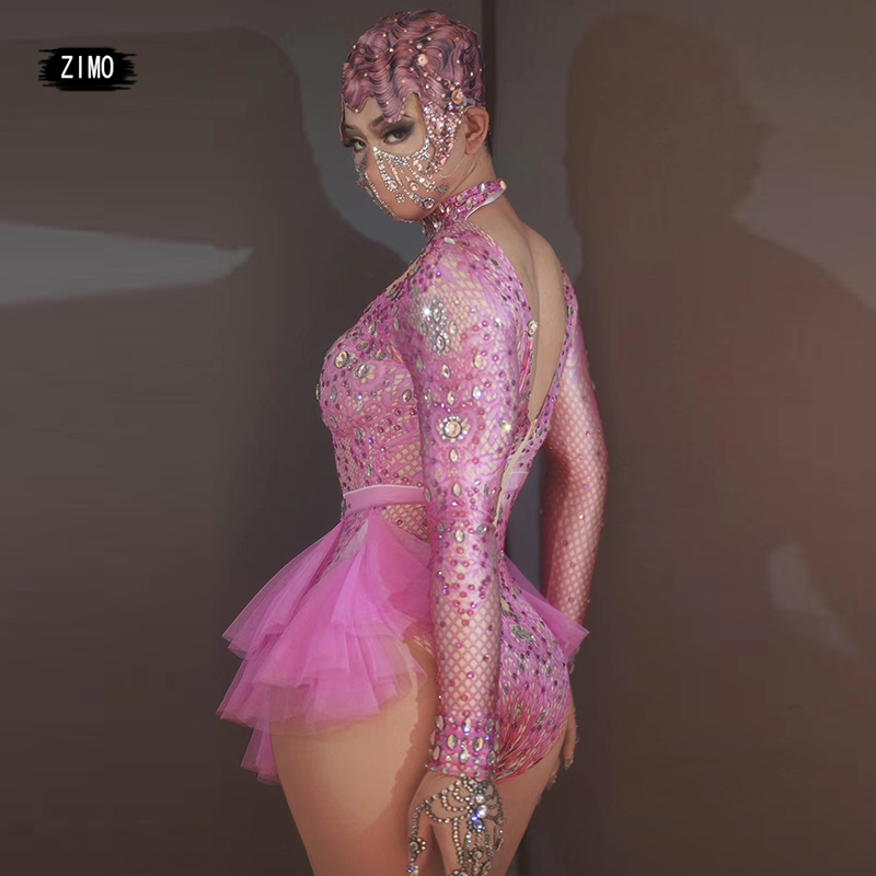 Rhinestone pink Ruffles Bodysuit Womens Big Stretch nightclub Prom Bar concert outfits Stage Singer Show dance Leotard
