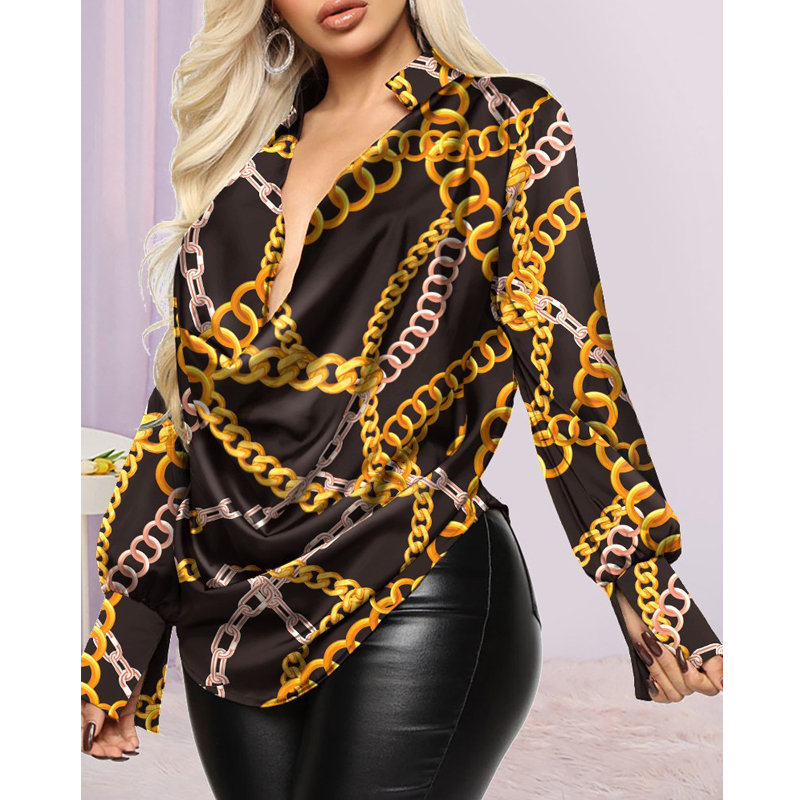 Spring Autumn Women Sexy Deep Cowl Neck Blouse Long Sleeve Casual Vintage Chain Graphic Print Long Sleeve Street Top Female