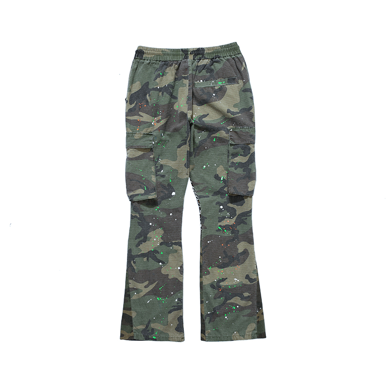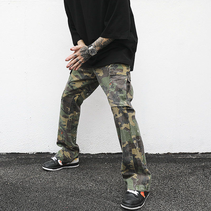 Streetwear Men Cargo Pants Hip-hop Distressed Camouflage Splash Flared Pants Men Women Pockets Drawstring Baggy Trousers
