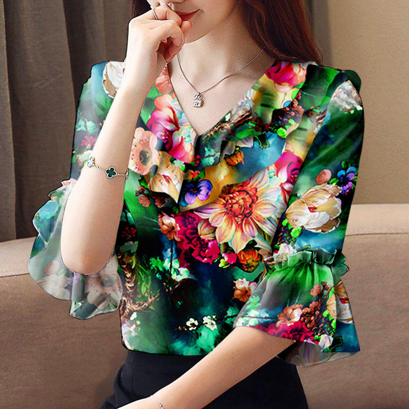 Summer Elegant Print Aesthetic Women's Shirt V Neck Short Sleeve Style Casual Tops Female Sweat Lady Blouse