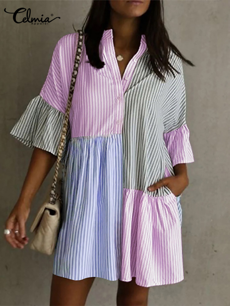 Summer Mini Dress Women Celmia Elegant Flare Half Sleeve Stripe Patchwork Shirt Dress Casual Loose Buttons Short Sundress