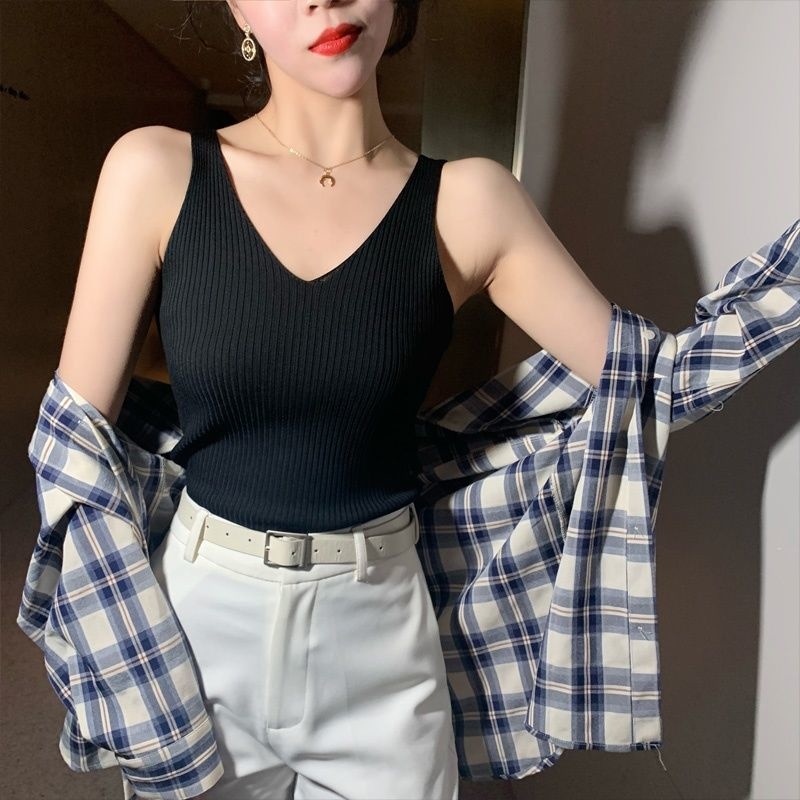 Summer V-neck Ice Silk Suspender Vest Women Inner And Outer Knitted Bottomed Shirt Top