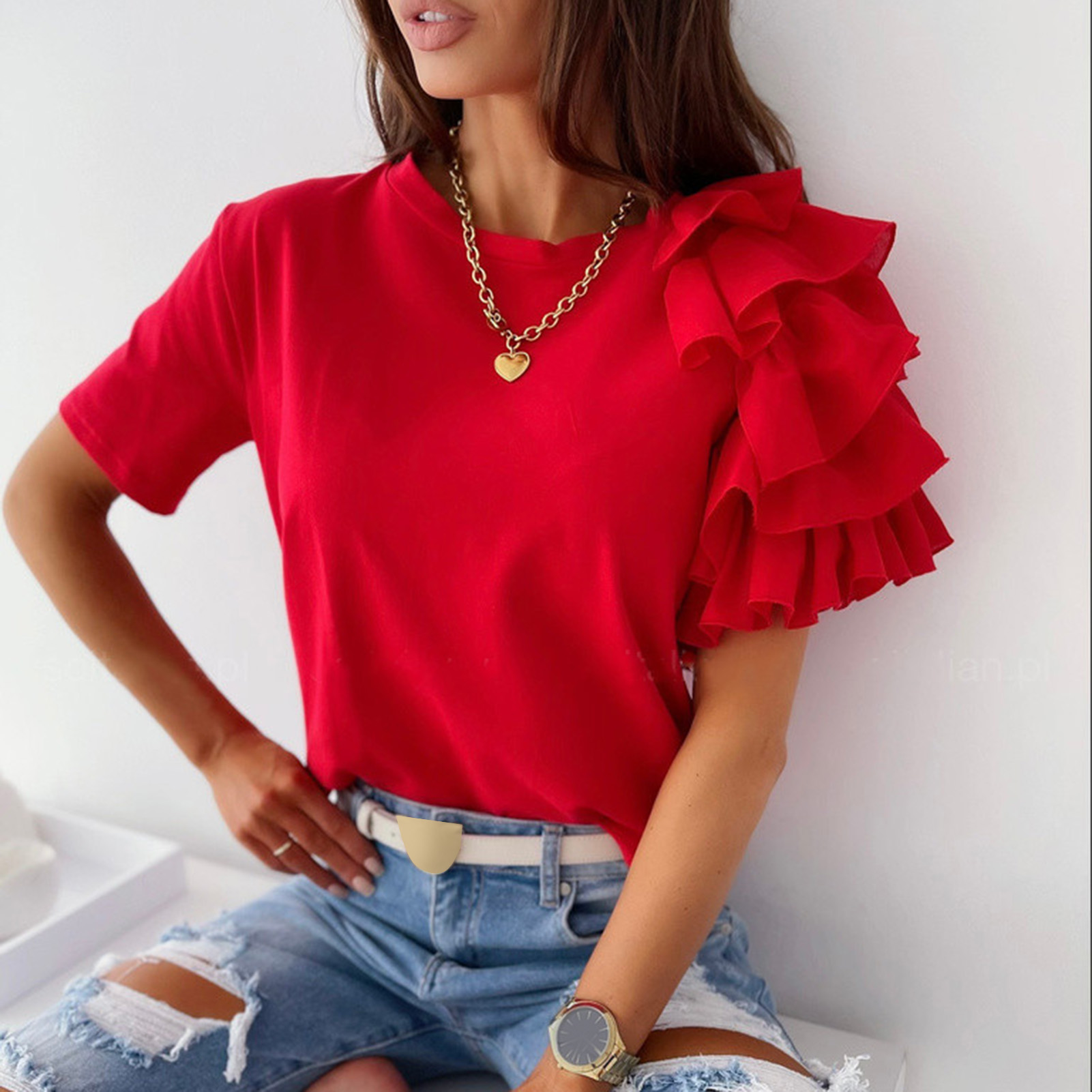 Summer Women Casual Ruffle Lace Short Sleeve Blouses Female Ladies Loose Casual Solid Color Holiday Blouse Top Outfits