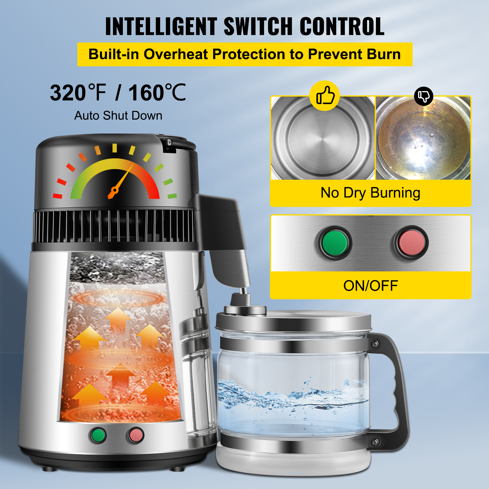 Efficient Water Purification: Power level: 750W; volume: 4L/1.1 gallon. This water distiller can distill 6 gal/22.7 L per day to eliminate dissolved solids, VOCs, and almost all other impurities, offering you the purest water. Ideal for distilling water, alcohol, and so on. Perfect for offices, homes, labs, dental clinics, etc.