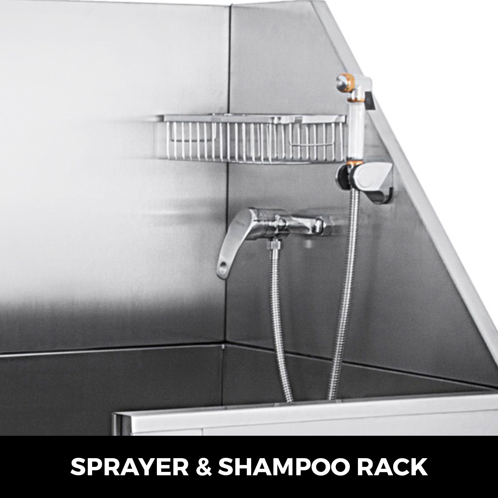 The grooming tub for dog includes stainless steel shampoo rack, high pressure sprayer. Freely adjust hot & cold water outlet with tap, and water spraying volume.