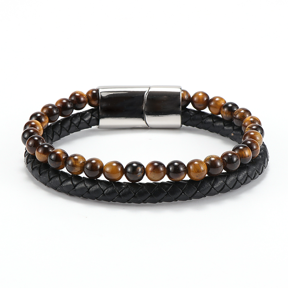 Item::Vintage Men's Jewelry Black Genuine Leather & Natural Stone Bead Bracelet Stainless Steel Magnetic Buckle Homme Wristband Bangle
