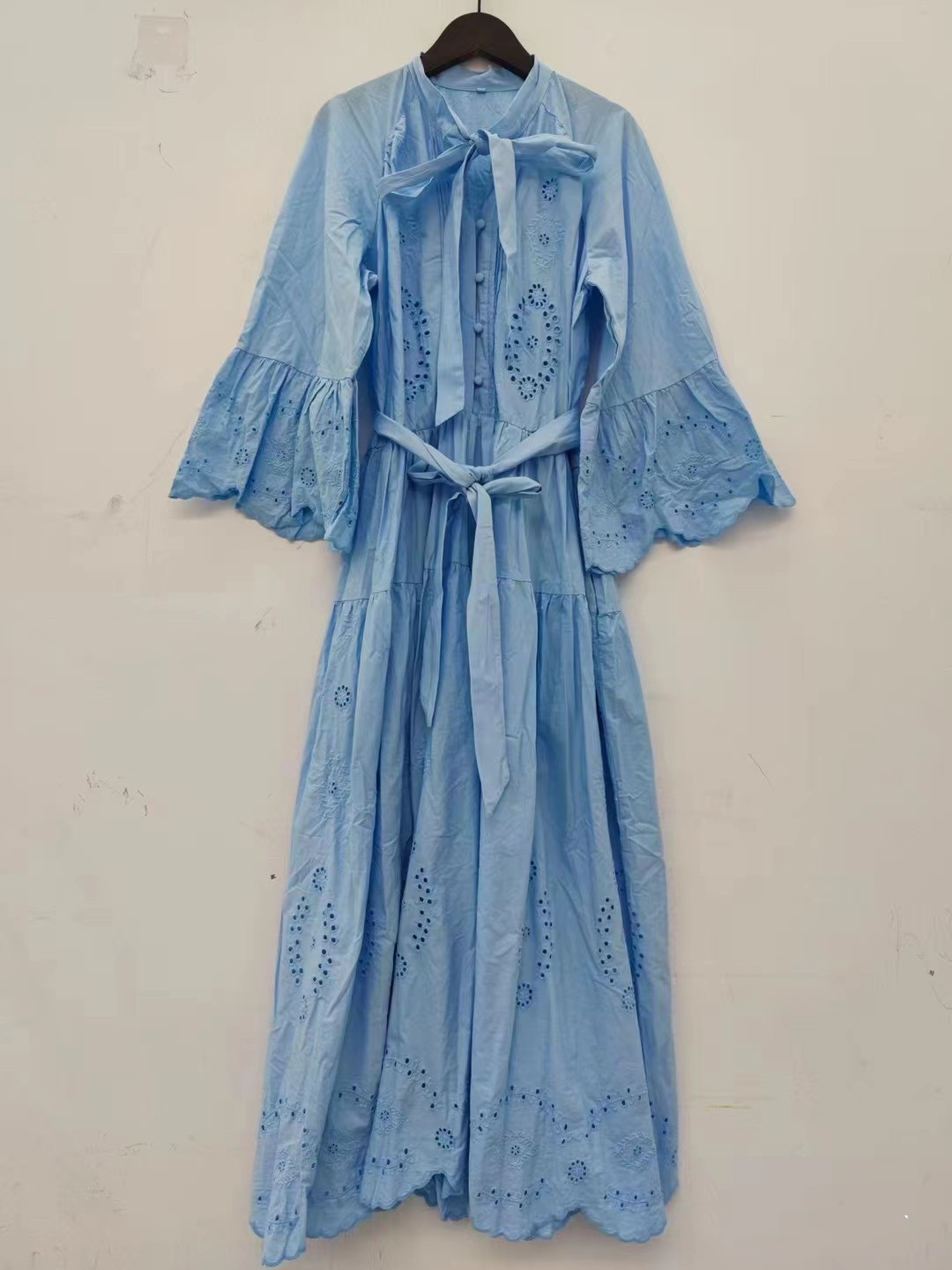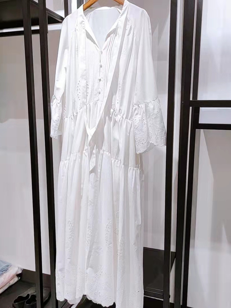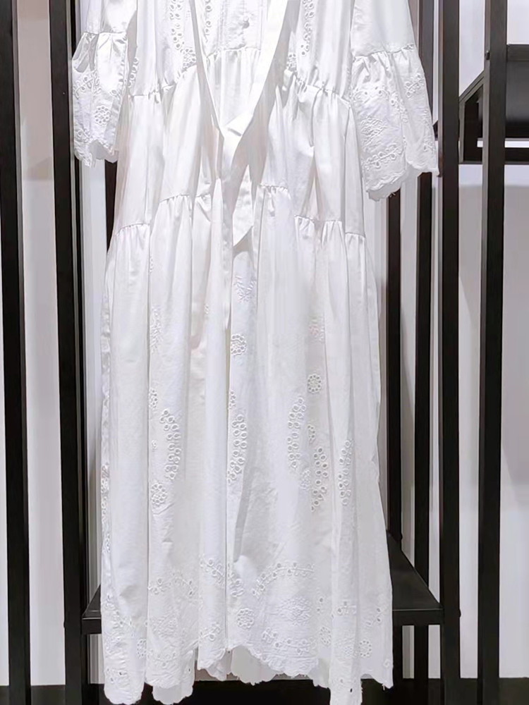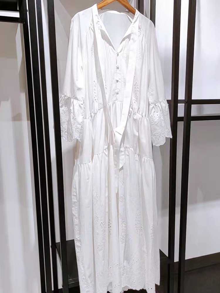 Women Hollow out Embroidery Dress White Bow Lace-up Temperament Front Button Simple Spring Ladies Midi Robe