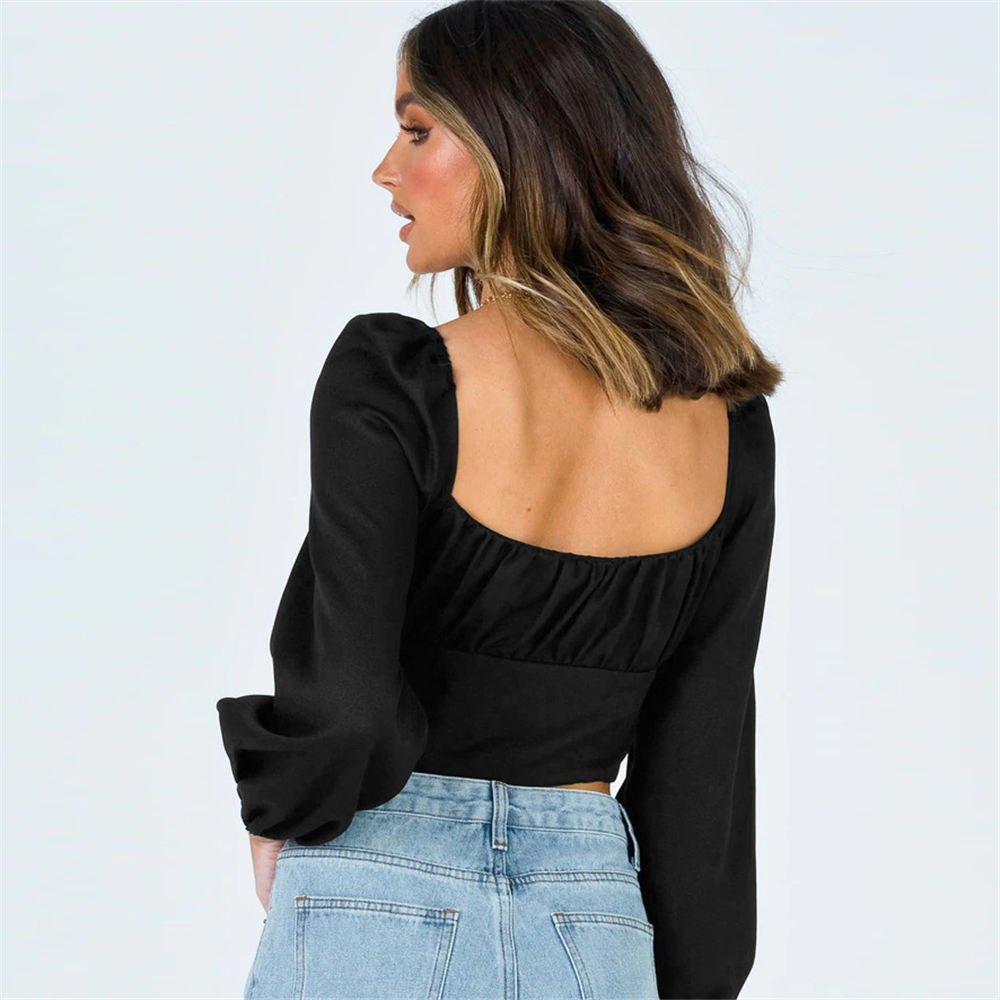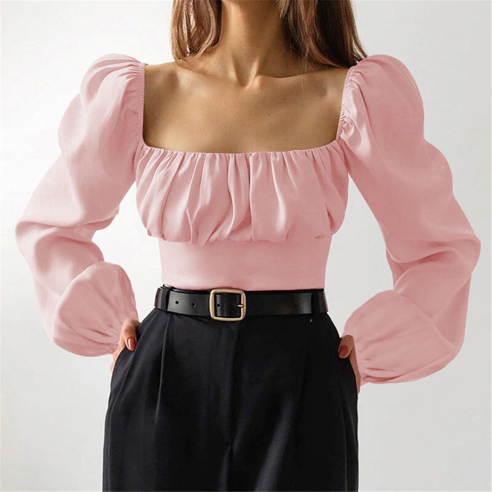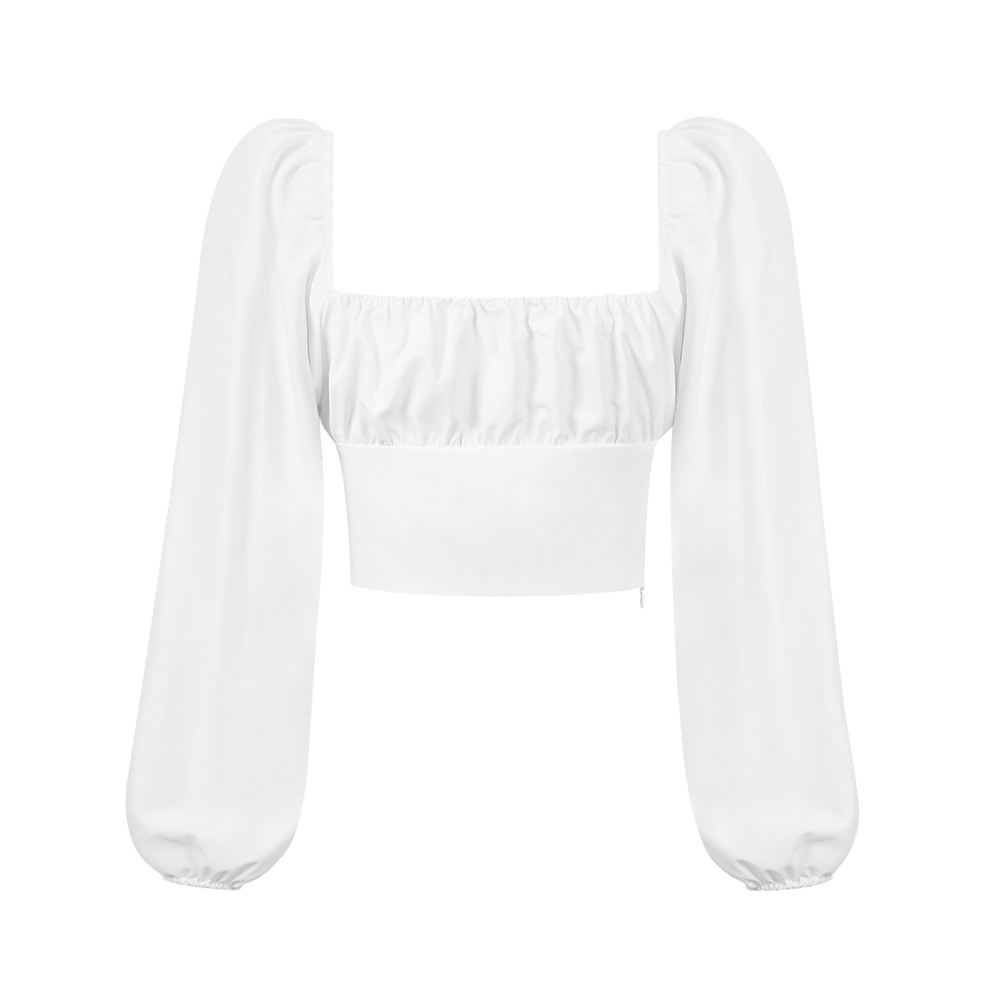 Women Slash Neck Blouse Ladies Girls Long Puff Sleeve Folds Waist Backless Short Shirt Female Crop Clothes