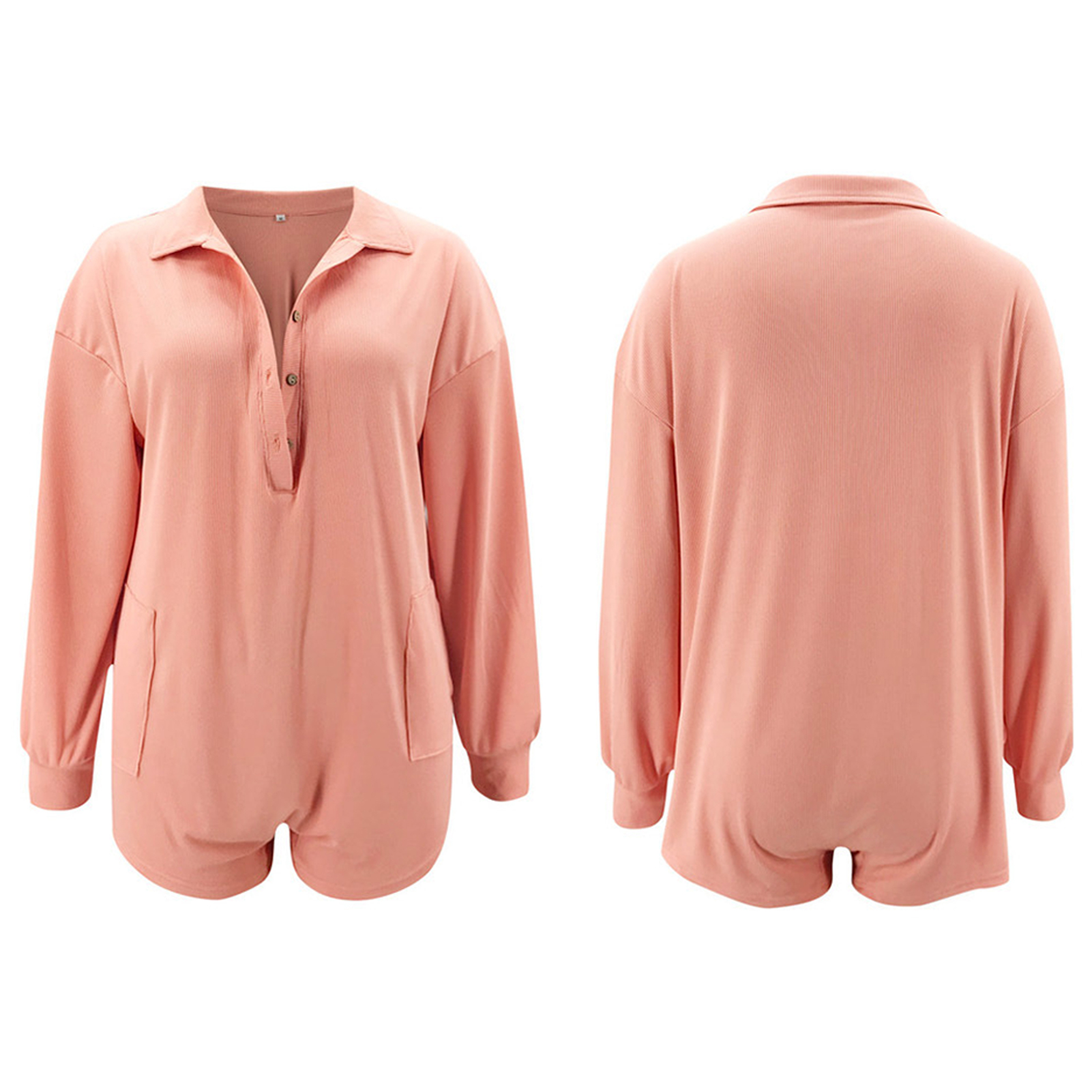 Women Solid Color Turn Down Collar V Neck Pocket Romper Spring Autumn Playsuit