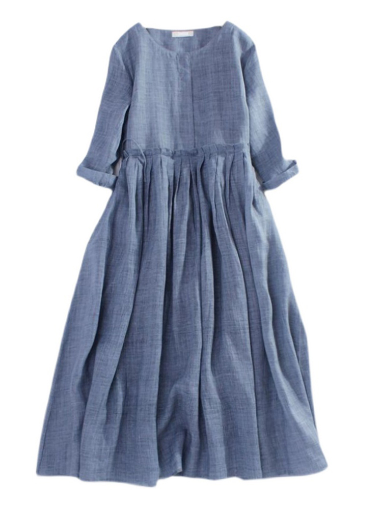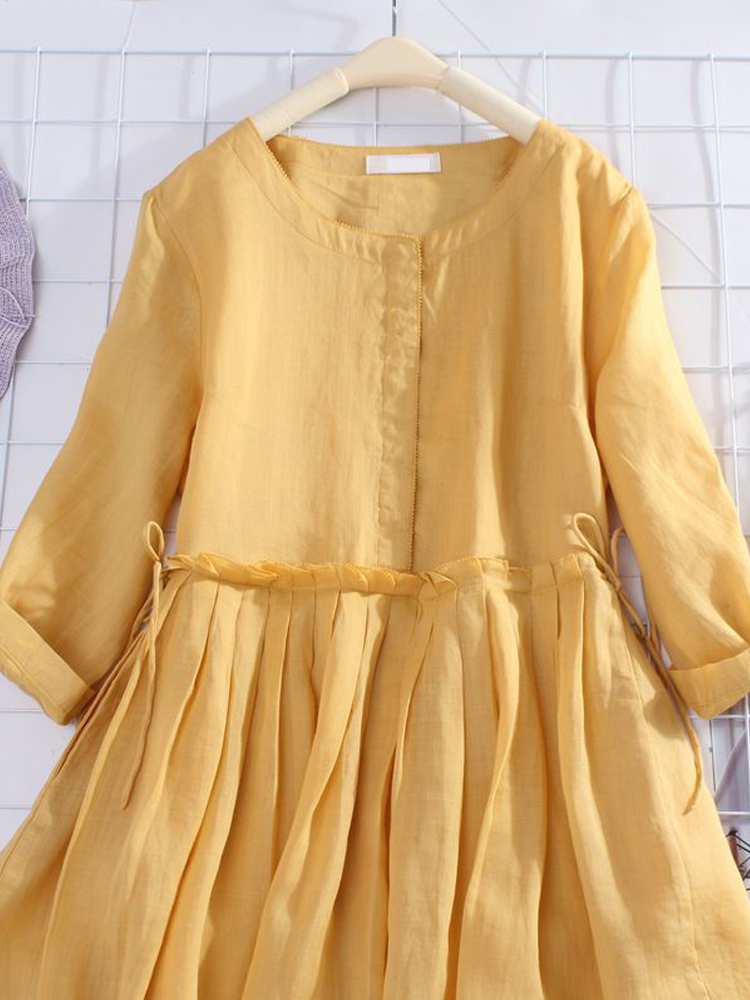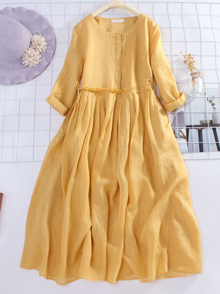 Women Summer Simple Style Cotton Linen Dresses Long Sleeve Drawstring Large Swing Solid Color Shirt Dress