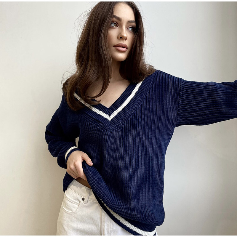 Women V-Neck Long Sleeve Sweater Casual Long Sleeve Pullover Knitted Tops Autumn Winter Female Sweater