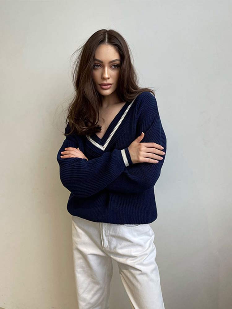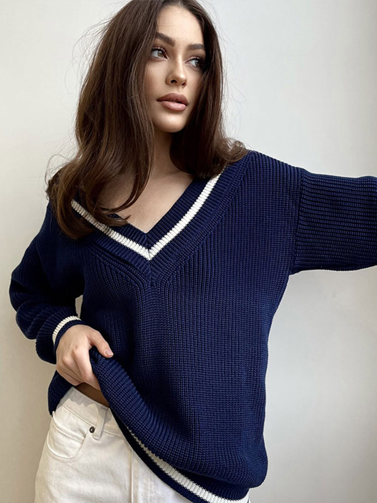 Women V-Neck Long Sleeve Sweater Casual Long Sleeve Pullover Knitted Tops Autumn Winter Female Sweater
