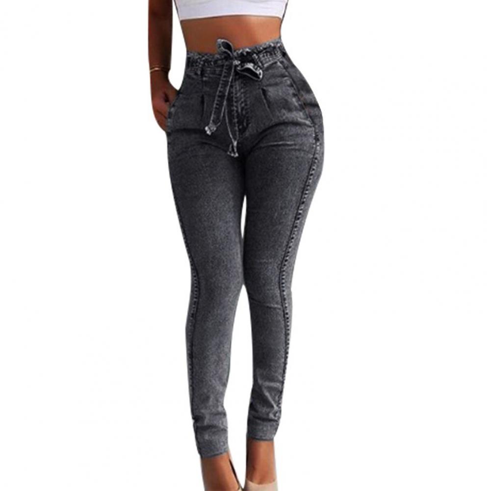 High Waist Multi Pockets Women Jeans Slim Tassel Bandage Push Up Denim Pants Trousers